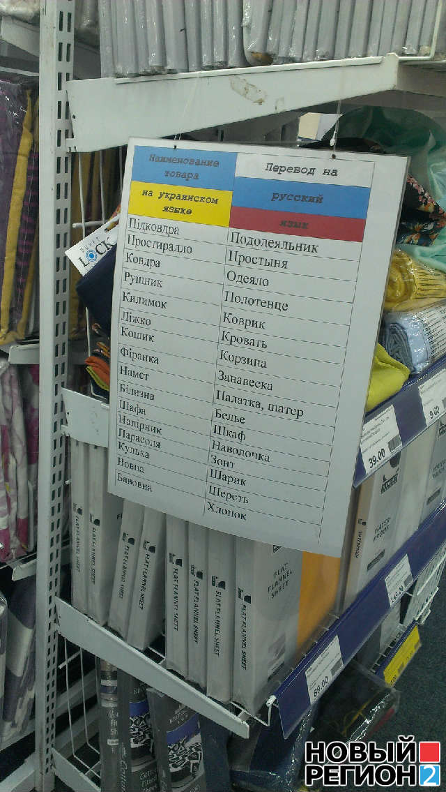 Як зазаначається в повідомленні, Jysk відмовляється від використання цінників та покажчиків російською мовою, яку, згідно з результатами перепису, вважає рідною понад 90% населення міста. Натомість у залі розміщено кілька табличок з пам'ятками - перекладом назв товарів з української на російську мову. Очевидно, це зробили задля зменшення наватаження продавців відповідями на питання покупців.